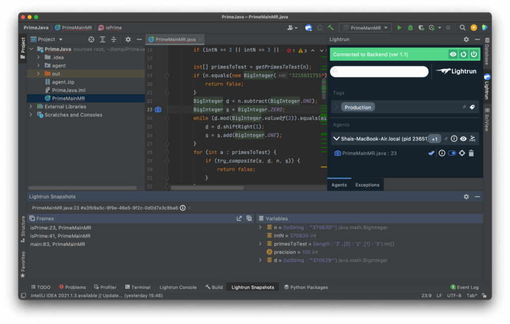 This is where Lightrun steps in to make this process trivial and secure without risking your uptime. Notice that this short tutorial uses a simple prime main calculation app for demonstration purposes. But you can use pretty much any application with Lightrun. The one constraint is that it’s “long running”, so a hello world application will end too quickly and we won’t have time to attach to it.
