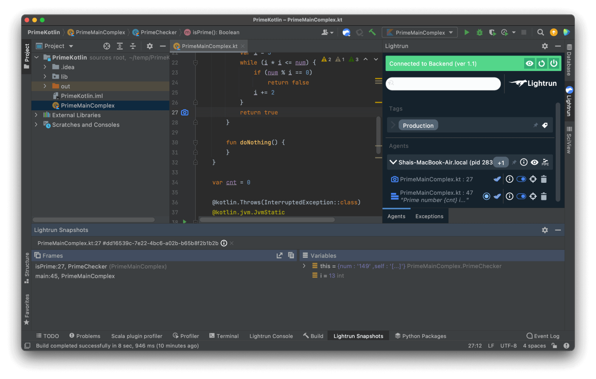 This is where Lightrun steps in to make this process trivial and secure without risking your uptime. Notice that this short tutorial uses a simple prime main calculation app for demonstration purposes. But you can use pretty much any Kotlin application with Lightrun. The one constraint is that it’s “long running”, so a hello world application will end too quickly and we won’t have time to attach to it.