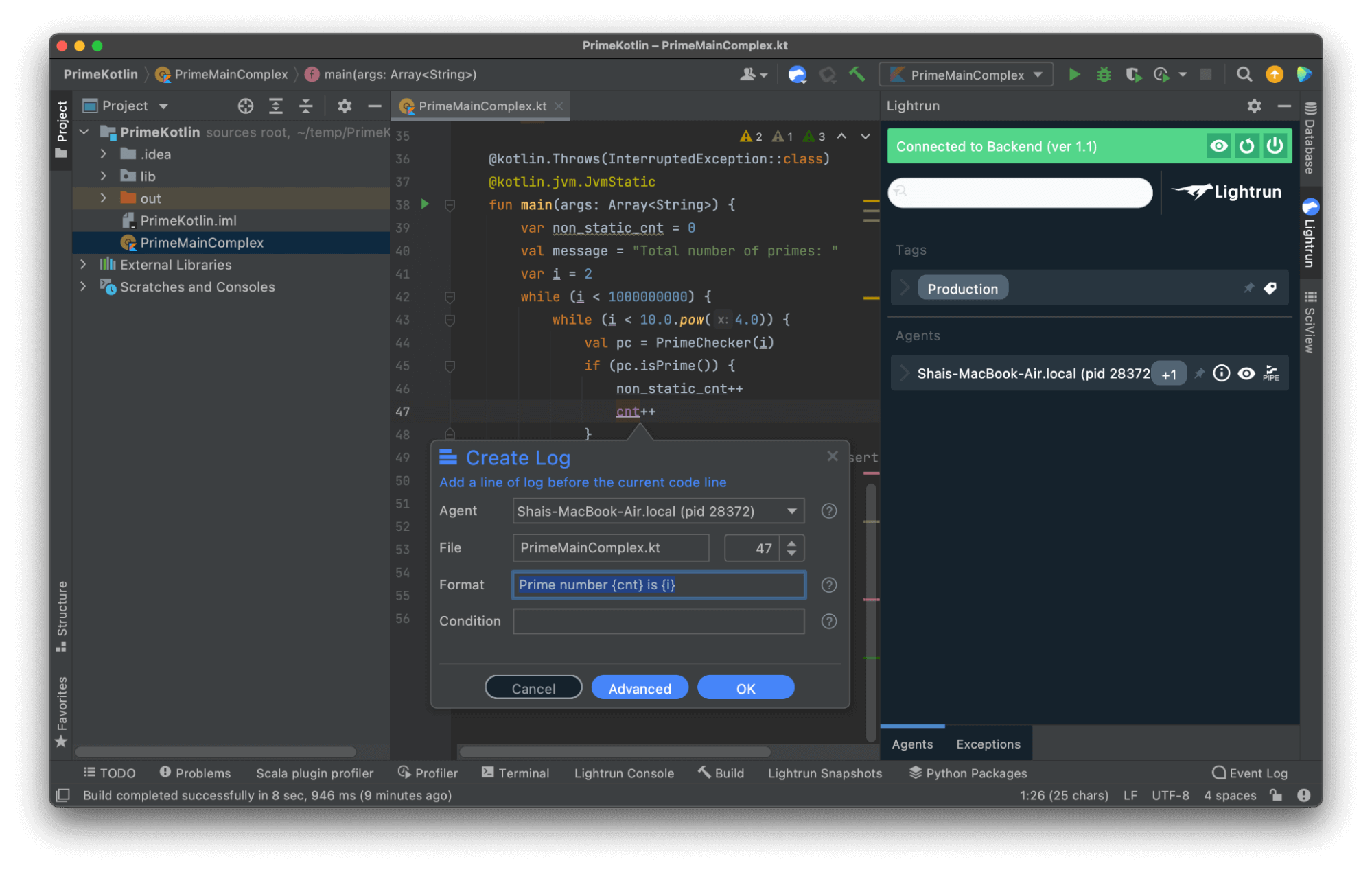 In the IDE open the PrimeMainComplex.kt file. Go to line 47 and right click on it. Select Lightrun and Log: