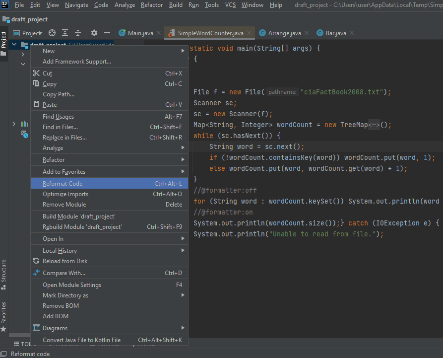 Now that your project is set up, it’s time to add some sample code to help you understand code reformatting in IntelliJ. This is a simple word counter from the University of Texas: